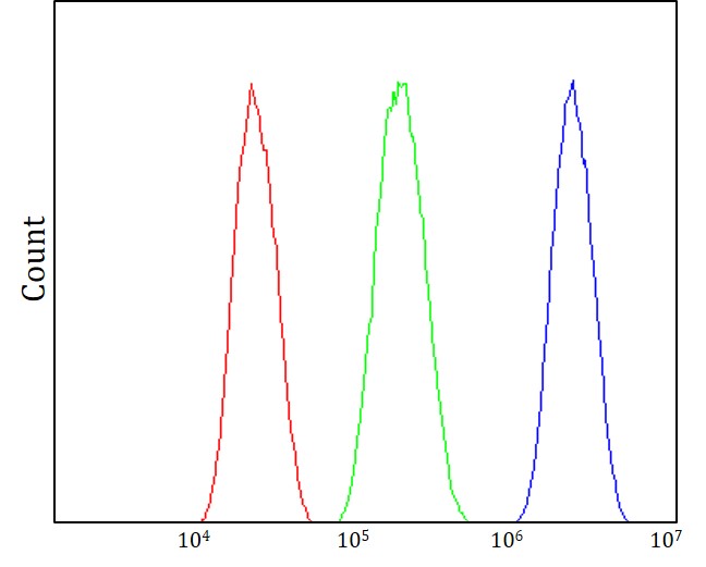 Flow Cytometry: CACO-2 stained with ARG43756 anti-Prominin 1 antibody at 1 μg / 10^6 cells dilution.