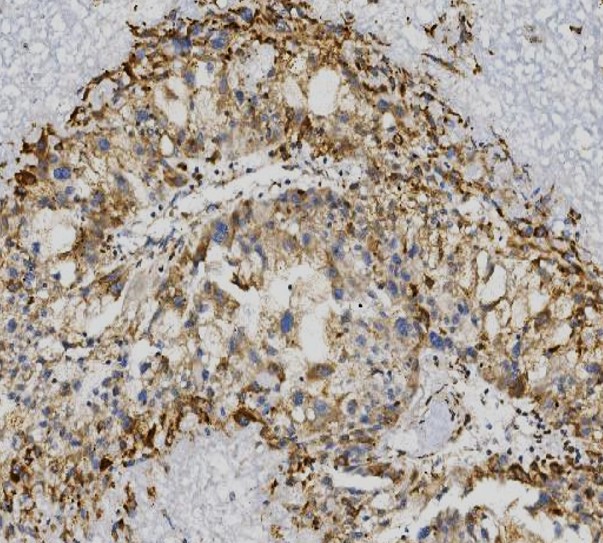 Immunohistochemistry: Human liver cancer stained with ARG43756 anti-Prominin 1 antibody at 1 μg/ml dilution.