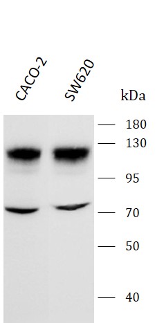 Western blot: CACO-2 and SW620 stained with ARG43756 anti-Prominin 1 antibody at 0.5 μg/mL dilution.