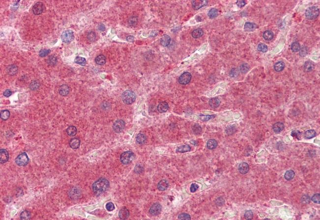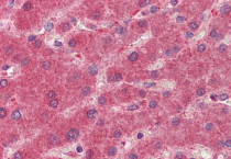 Immunohistochemistry: Paraffin-embedded Human liver tissue. Antigen Retrieval: Steam tissue section in Citrate buffer (pH 6.0). The tissue section was stained with ARG63685 anti-Prostaglandin dehydrogenase 1 antibody at 2.5 µg/ml dilution followed by AP-staining.