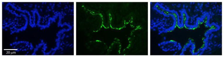 Immunohistochemistry: Formalin-fixed and paraffin-embedded Human bronchial epithelial tissue stained with ARG42601 anti-RAB1A antibody (green) at 1:100 dilution.