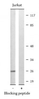 Western blot: Jurkat cell lysates stained with ARG66779 anti-RAB38 antibody. The lane on the right is blocked with the synthetic peptide.