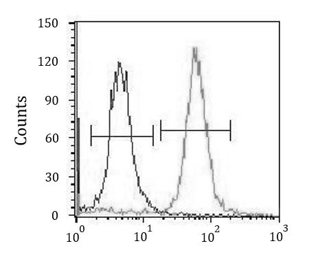 Flow Cytometry: K562 cells stained with ARG41218 anti-RAB3D antibody (right histogram) or without primary antibody as control (left histogram), followed by incubation with FITC labelled secondary antibody.
