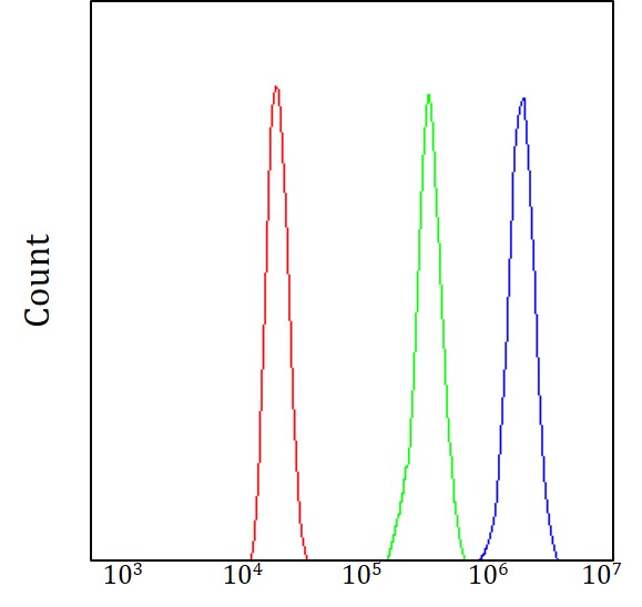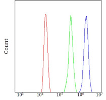 Flow Cytometry: HL-60 cells stained with ARG43877 anti-RAB43 antibody (blue) at 1 μg/1x10^6 cells dilution.