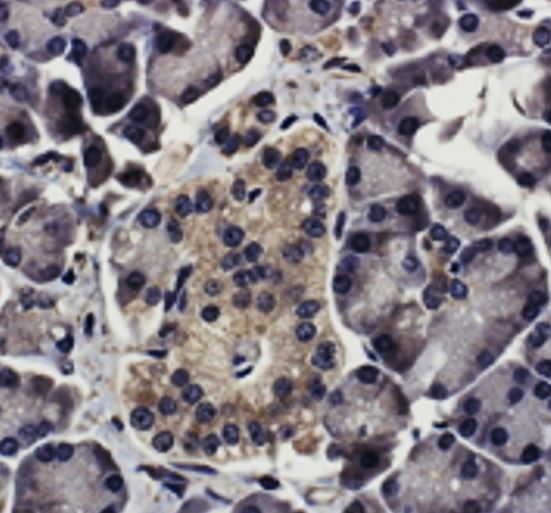 Immunohistochemistry: Mouse pancreas stained with ARG42511 anti-RAB5B antibody at 1:250 dilution.