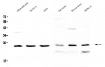 Western blot: 50 µg of samples under reducing conditions. MDA-MB-453, SK-OV-3, A431, Rat testis, Mouse brain and HEPA1-6 lysates stained with ARG59020 anti-RAB6A antibody at 0.5 µg/ml, overnight at 4°C.