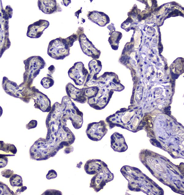 Immunohistochemistry: Paraffin-embedded Human placenta tissue. Antigen Retrieval: Heat mediation was performed in Citrate buffer (pH 6.0) for 20 min. The tissue section was blocked with 10% goat serum. The tissue section was then stained with ARG59020 anti-RAB6A antibody at 2 µg/ml dilution, overnight at 4°C.