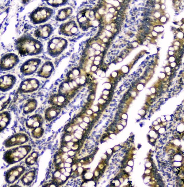 Immunohistochemistry: Paraffin-embedded Rat small intestine tissue. Antigen Retrieval: Heat mediation was performed in Citrate buffer (pH 6.0) for 20 min. The tissue section was blocked with 10% goat serum. The tissue section was then stained with ARG59020 anti-RAB6A antibody at 1 µg/ml dilution, overnight at 4°C.