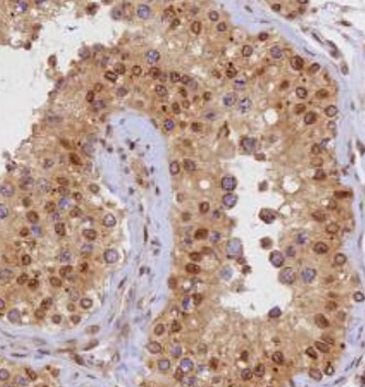 Immunohistochemistry: Human testis stained with ARG44732 anti-RANGAP1 antibody at 1 µg/mL dilution.