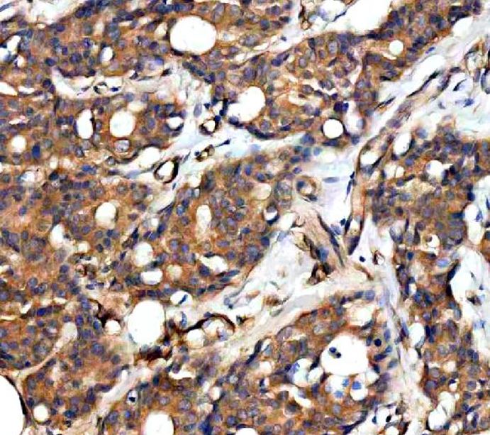 Immunohistochemistry: Human breast cancer stained with ARG45635 anti-RAPH1 antibody at 2 μg/ml dilution.