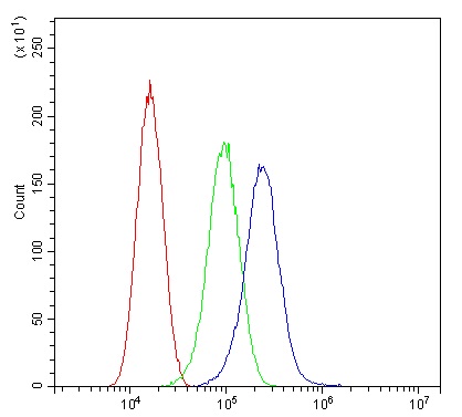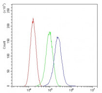 Flow Cytometry: SiHa cells were blocked with 10% normal goat serum and then stained with ARG59051 anti-RBBP4 / RbAp48 antibody [9F3] (blue) at 1 µg/10^6 cells for 30 min at 20°C, followed by incubation with DyLight®488 labelled secondary antibody. Isotype control antibody (green) was rabbit IgG (1 µg/10^6 cells) used under the same conditions. Unlabelled sample (red) was also used as a control.