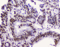 Immunohistochemistry: Paraffin-embedded Human intestinal cancer tissue. Antigen Retrieval: Heat mediation was performed in Citrate buffer (pH 6.0) for 20 min. The tissue section was blocked with 10% goat serum. The tissue section was then stained with ARG59051 anti-RBBP4 / RbAp48 antibody [9F3] at 1 µg/ml dilution, overnight at 4°C.