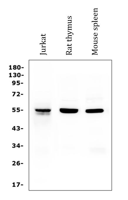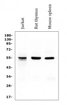 Western blot: 50 µg of sample under reducing conditions. Jurkat, Rat thymus and Mouse spleen lysates stained with ARG59051 anti-RBBP4 / RbAp48 antibody [9F3] at 0.5 µg/ml dilution, overnight at 4°C.