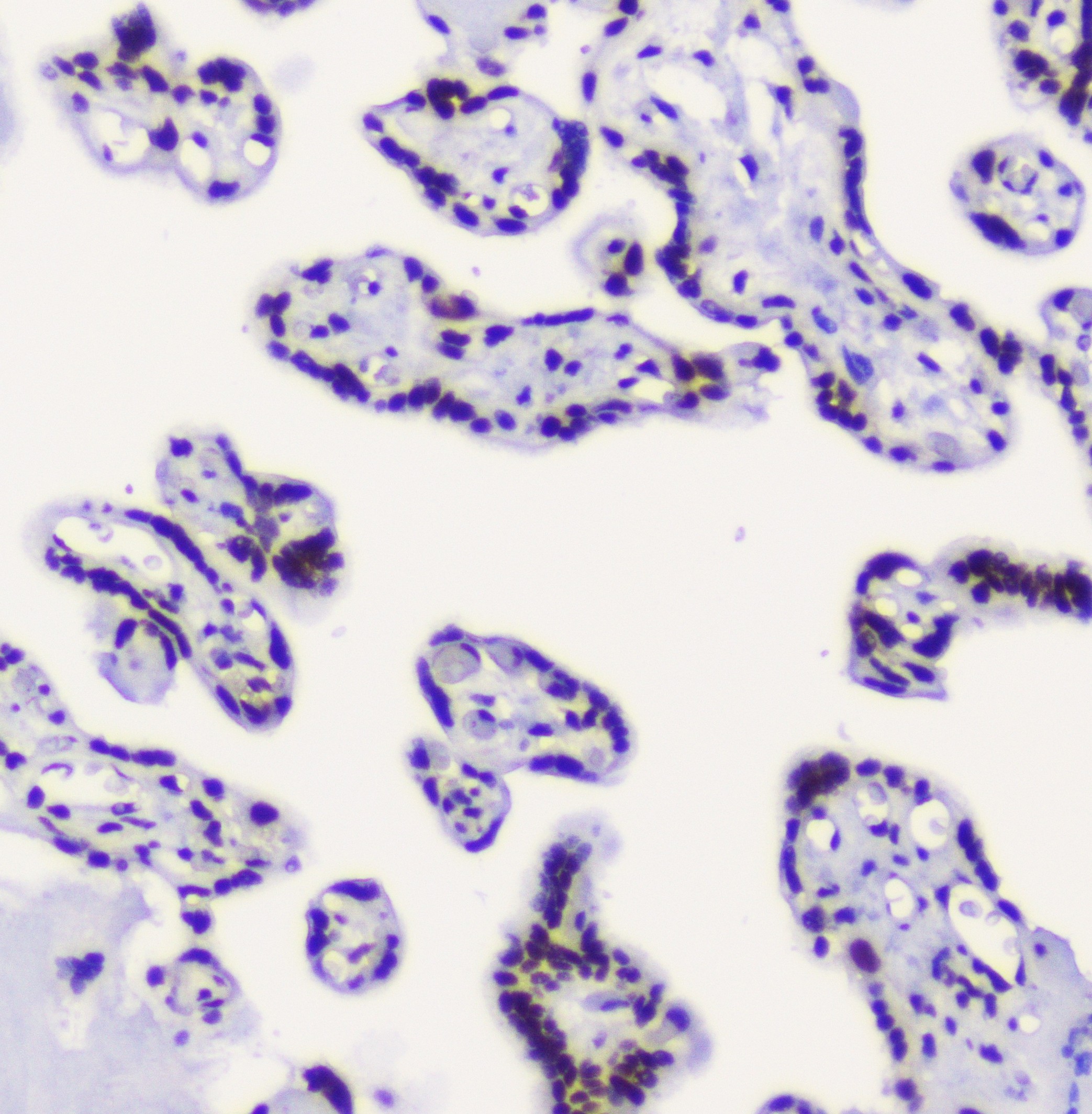 Immunohistochemistry: Paraffin-embedded Human placenta tissue. Antigen Retrieval: Heat mediated was performed in Citrate buffer (pH 6.0, epitope retrieval solution) for 20 min. The tissue section was blocked with 10% goat serum. The tissue section was then stained with ARG59051 anti-RBBP4 / RbAp48 antibody [9F3] at 2 µg/ml dilution, overnight at 4°C.