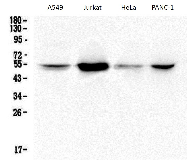 Western blot: 50 µg of samples under reducing conditions. A549, Jurkat, HeLa and PANC-1 cell lysates stained with ARG59051 anti-RBBP4 / RbAp48 antibody [9F3] at 0.5 µg/ml, overnight at 4°C.