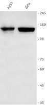Western blot: A431 and Hela stained with ARG45405 anti-RBM12B antibody at 0.5 μg/ml dilution.