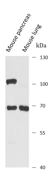 Western blot: Mouse pancreas and Mouse lung stained with ARG44341 anti-RBM15B antibody at 1:1000 dilution.