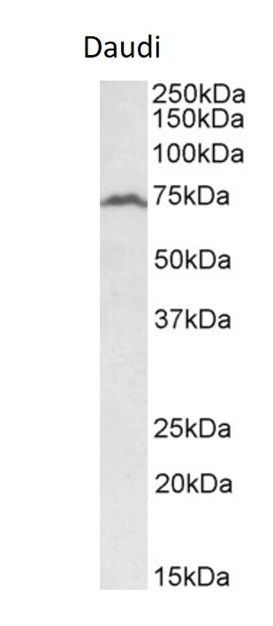 Western blot: 35 µg of Daudi cell lysate (in RIPA buffer) stained with ARG58777 anti-RFX5 antibody at 2 µg/ml and incubated for 1 hour at RT.