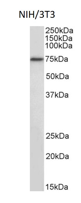 Western blot: 35 µg of NIH/3T3 cell lysate (in RIPA buffer) stained with ARG58777 anti-RFX5 antibody at 2 µg/ml and incubated for 1 hour at RT.