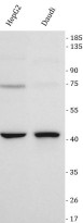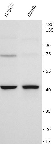 Western blot: HepG2 and Daudi stained with ARG45257 anti-RG9MTD1 antibody at 0.5 μg/ml dilution.