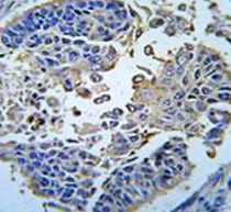 Immunohistochemistry: Formalin-fixed and paraffin-embedded Human lung carcinoma tissue stained with ARG54881 anti-RIPK3 / RIP3 antibody.