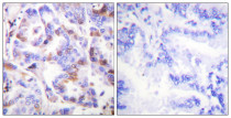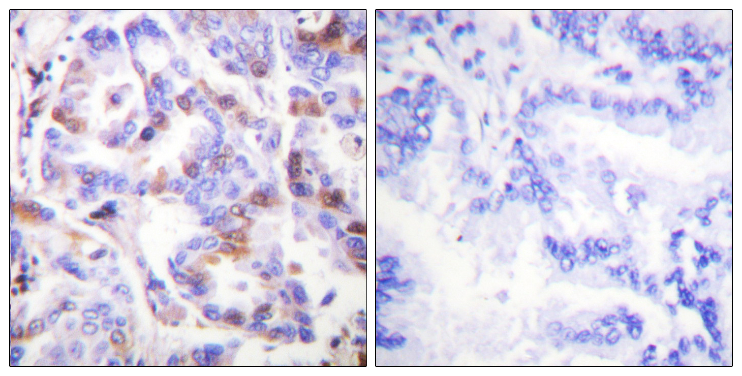 Immunohistochemistry: Paraffin-embedded Human lung carcinoma tissue stained with ARG66658 anti-RPA2 / RPA32 phospho (Thr21) antibody. The picture on the right is blocked with the phospho peptide.