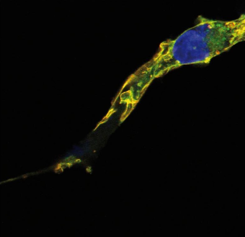Immunofluorescence: Colocalization of RRAS2 / TC21 signal (red) and GFP signal (green) in COS cells transfected with RRAS2 / TC21-GFP construct, after fixation and permeabilization. RRAS2 / TC21 was detected using ARG57574 anti-RRAS2 / TC21 antibody [EM-50].