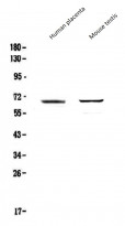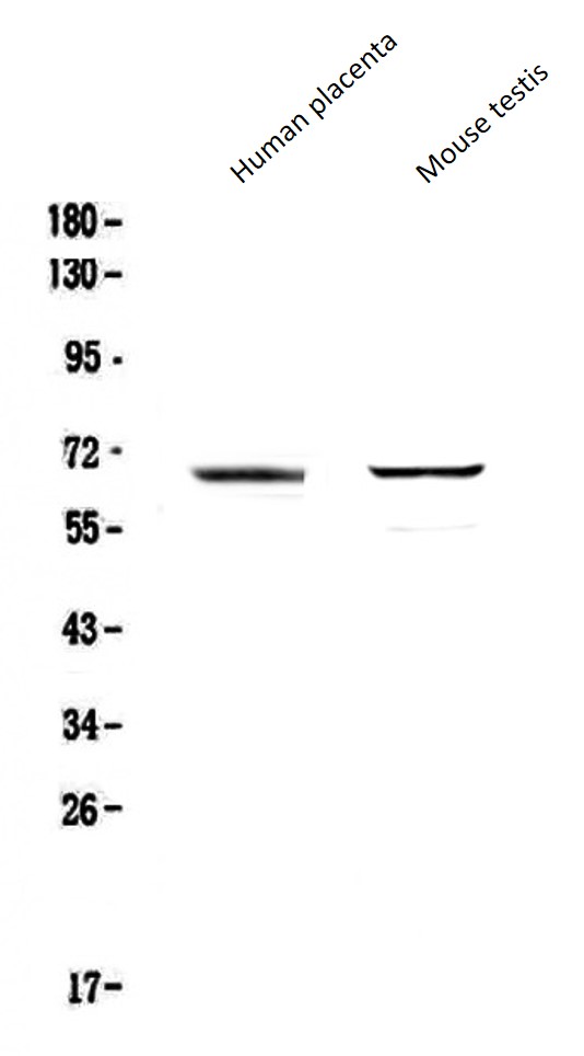 Western blot: 50 µg of Human placenta and Mouse testis lysates stained with ARG58296 anti-RUNX1T1 / ETO antibody at 0.5 µg/ml, overnight at 4°C, under reducing conditions.