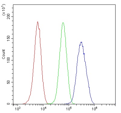Flow Cytometry: U2OS cells were blocked with 10% normal goat serum and then stained with ARG58296 anti-RUNX1T1 / ETO antibody (blue) at 1 µg/10^6 cells for 30 min at 20°C, followed by incubation with DyLight®488 labelled secondary antibody. Isotype control antibody (green) was rabbit IgG (1 µg/10^6 cells) used under the same conditions. Unlabelled sample (red) was also used as a control.