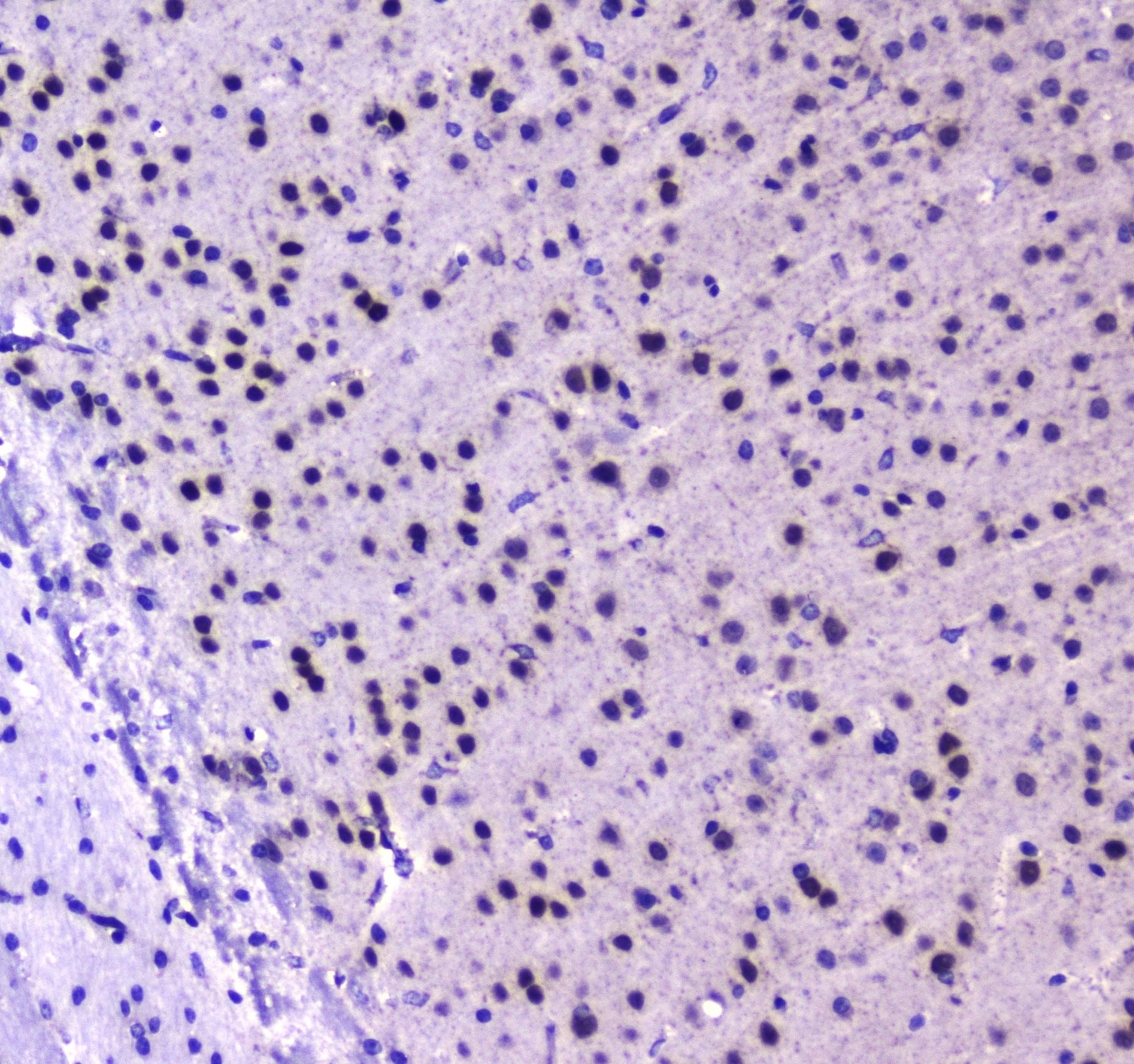 Immunohistochemistry: Paraffin-embedded Mouse brain tissue. Antigen Retrieval: Heat mediated was performed in Citrate buffer (pH 6.0, epitope retrieval solution) for 20 min. The tissue section was blocked with 10% goat serum. The tissue section was then stained with ARG58296 anti-RUNX1T1 / ETO antibody at 1 µg/ml dilution, overnight at 4°C.