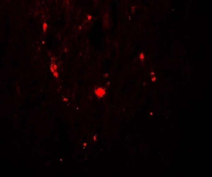 Immunohistochemistry: 4% Paraformaldehyde-fixed Human brain tissue stained with ARG42235 anti-SAMHD1 phospho (Thr592) antibody (red) at 20 µg/ml dilution.
