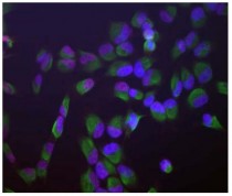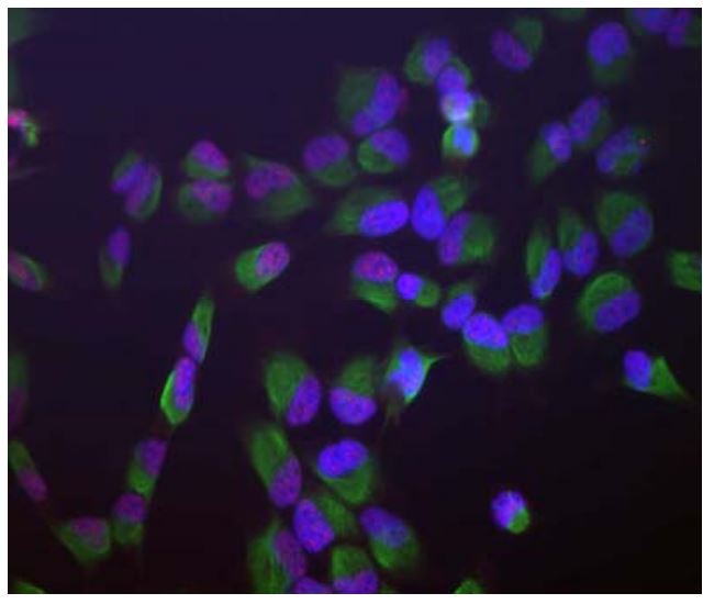 Immunofluorescence: HeLa cells stained with ARG52421 anti-SAP49 antibody [3A1] showing strong granular nuclear staining of SAP49 in red and vimentin (ARG52468 anti-vimentin antibody) in green.
