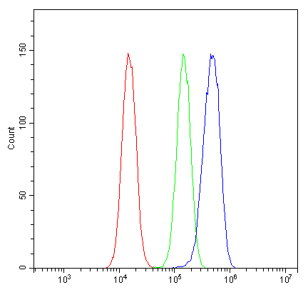 Flow Cytometry: U-87 cells were blocked with 10% normal goat serum and then stained with ARG42591 anti-SCN11A antibody (blue) at 1 µg/10^6 cells for 30 min at 20°C, followed by incubation with DyLight®488 labelled secondary antibody. Isotype control antibody (green) was Rabbit IgG (1 µg/10^6 cells) used under the same conditions. Unlabelled sample (red) was also used as a control.