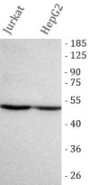 Western blot: Jurkat and HepG2 stained with ARG45454 anti-SEPHS1 antibody at 0.5 μg/ml dilution.