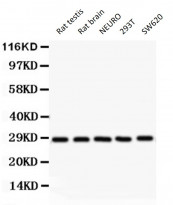 Western blot: 50 µg of Rat testis, 50 µg of Rat brain, 40 µg of NEURO, 40 µg of 293T and 40 µg of SW620 lysates stained with ARG59120 anti-SFRS1 / SF2 antibody at 0.5 µg/ml dilution.