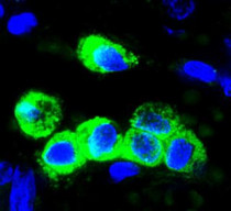 Immunofluorescence: Human lung cells stained with ARG59531 anti-SFTPC / SP-C antibody (green) at 1:25 dilution. DAPI was used to stain the cell nuclear (blue).
