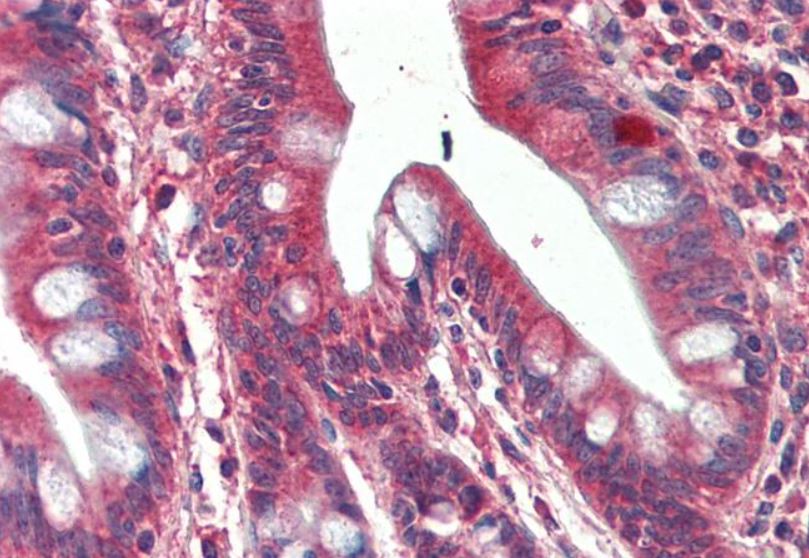 Immunohistochemistry: Paraffin-embedded Human small intestine tissue. Antigen Retrieval: Steam tissue section in Citrate buffer (pH 6.0). The tissue section was stained with ARG42131 anti-SH3GL1 / EEN antibody at 5 µg/ml dilution followed by AP-staining.