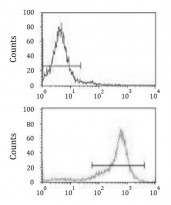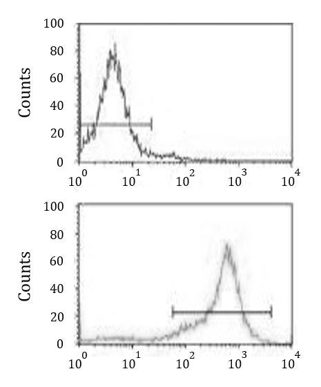 Flow Cytometry: 293 cells stained with ARG55762 anti-SHP2 antibody (bottom histogram) or without primary antibody control (top histogram), followed by incubation with FITC labelled secondary antibody.