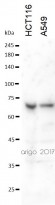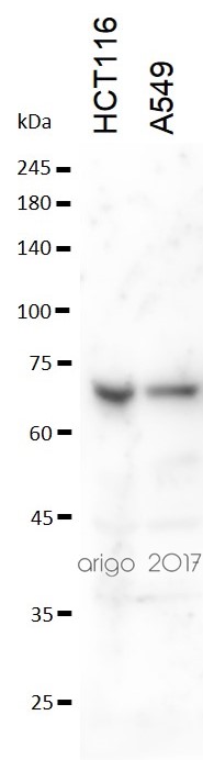 Western blot: 30 µg of HCT116 and A549 cell lysates stained with ARG55762 anti-SHP2 antibody at 1:1000 dilution.