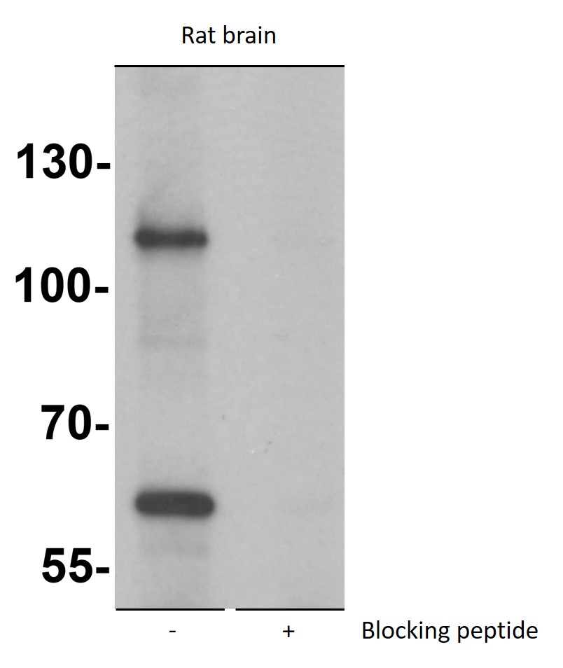 Western blot: Rat brain lysate stained with ARG40314 anti-SIK3 antibody at 1 µg/ml dilution in the absence (left) and the presence (right) of blocking peptide.