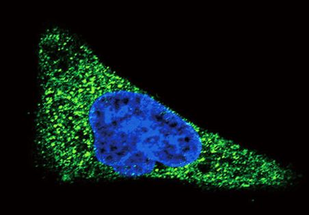 Immunofluorescence: HepG2 cells stained with ARG40510 anti-SLC11A2 / DMT1 antibody (green). DAPI (blue) for nuclear staining.