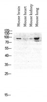 Western blot: Mouse brain, Mouse heart, Mouse kidney and Mouse lung lysates stained with ARG66669 anti-SLC15A1 / PepT1 antibody at 1:1000 dilution.