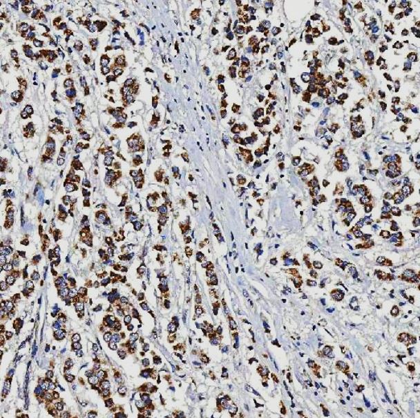 Immunohistochemistry: Human breast cancer stained with ARG45458 anti-SLC20A1 antibody at 2 μg/ml dilution.