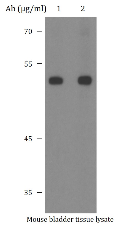 Western blot: Mouse bladder tissue lysate stained with ARG43456 anti-SLC29A3 / ENT3 antibody at 1 or 2 µg/ml dilution and incubated at RT for 1 hour, in 5% NFDM/TBST.