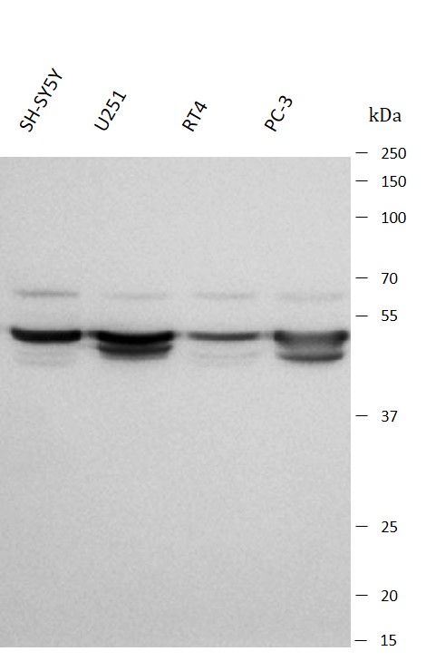 Western blot: SH-SY5Y, U251, RT4 andPC-3 stained with ARG44525 anti-SLC37A3 antibody at 0.5 μg/mL dilution.