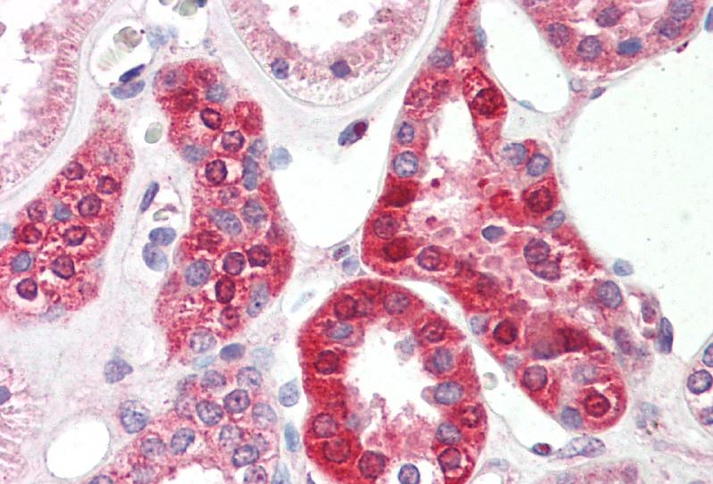 Immunohistochemistry: Paraffin-embedded Human kidney tissue. Antigen Retrieval: Steam tissue section in Citrate buffer (pH 6.0). The tissue section was stained with ARG42095 anti-SLC6A8 antibody at 5 µg/ml dilution followed by AP-staining.