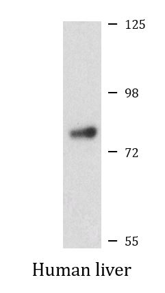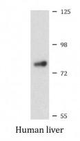 Western blot: Human liver lysate stained with ARG43402 anti-SLCO1B1 / OATP1B1 antibody at 1 µg/ml dilution.