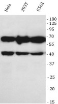 Western blot: Hela, 293T,and K562 stained with ARG45237 anti-SLU7 antibody at 0.5 μg/ml dilution.