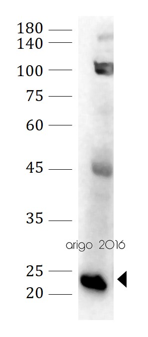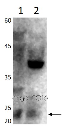 Western blot: 35 µg of Human testis lysate (in RIPA buffer) stained with ARG63416 anti-SM22 alpha / Transgelin antibody at 0.3 µg/ml dilution and incubated at RT for 1 hour.