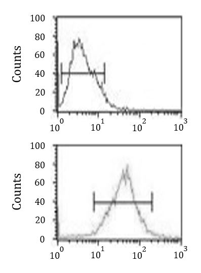 Flow Cytometry: MCF7 cells stained with ARG55763 anti-SNRPD3 antibody (bottom histogram) or without primary antibody control (top histogram), followed by incubation with FITC labelled secondary antibody.